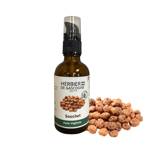 Le Souchet est une plante comestible originaire d'Afrique du Nord et d'Afrique tropicale. Le plant de souchet possède des tubercules rhizomateux courts et coniques appelés plus communément "amande de terre", dont on extrait l'huile vierge de Souchet. Excellente huile de table, elle fût largement utilisée par les Egyptiens il y a 4000 ans. Aujourd'hui, on retrouve parfois le souchet dans les épiceries et les bazars arabes sous son nom anglais : "Tigernut" qui signifie "noix tigrée".