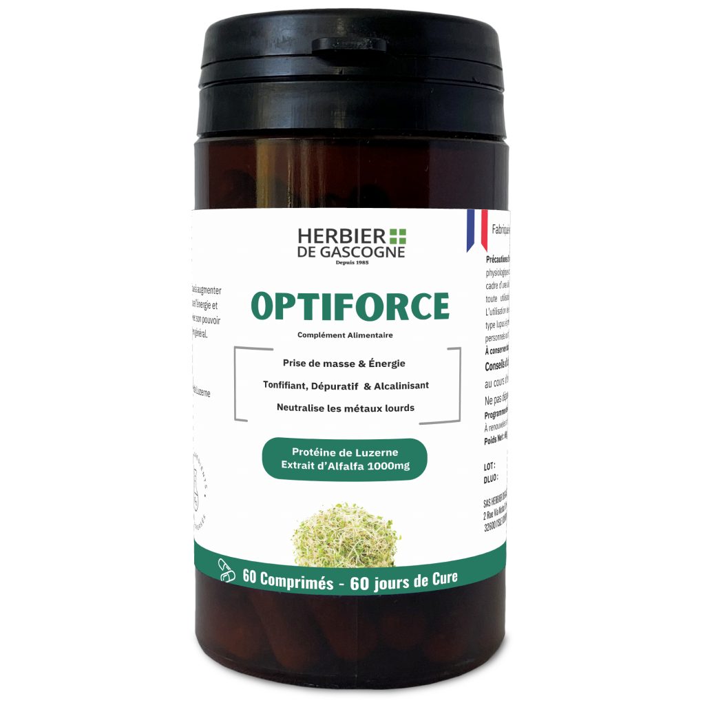 OptiForce, un complexe à molécules actives : La Protéine de Luzerne (Extrait d’Alfalfa) contribue à augmenter la masse musculaire et à son maintien. Elle favorise l’énergie et neutralise les métaux lourds dans l’organisme. Avec son pouvoir dépuratif et alcalinisant, elle tonifie l’organisme en général.