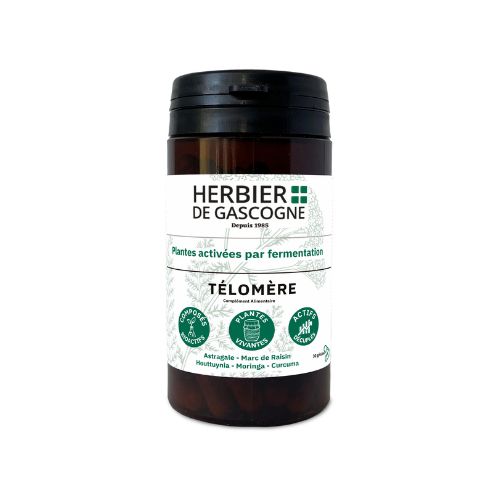 Le Complexe Télomère est un antioxydant puissant général, il agît comme un protecteur d’ADN. L’Astragale possède une activité anti-âge, le Marc de Raisin aide à protéger les cellules et tissus (stress, U.V, pollution), le Moringa aide à maintenir un taux normal de glucose et le Curcuma à destocker les graisses au niveau du foie.