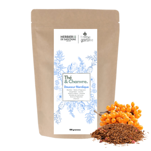 Composition : Rooibos, Baies d’Argousier, Morceaux de Pomme, Écorces d’Églantier, Gingembre, Carottes, Hibiscus Blanc, Arôme Naturel, Pétales de Carthame, Chanvre Fleur et Feuille (20%)