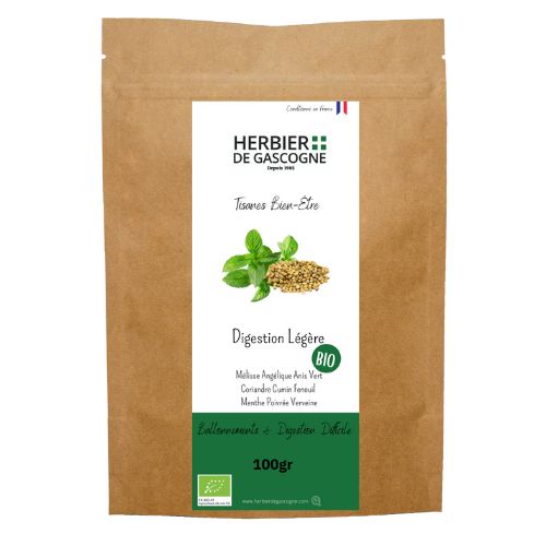 La Mélisse possède de nombreux bienfaits. C'est une plante inscrite à la Pharmacopée Française et son emploi est reconnu comme étant traditionnellement utilisée pour agir sur les troubles digestifs tels que les ballonnements épigastriques, lenteur à la digestion, éructations, flatulence. L’Angélique Semence est une plante qui améliore la digestion, diminue les gaz, les ballonnements et les spasmes intestinaux, ouvre l'appétit et protège l'estomac et le foie. L’Anis Vert Semence apaise les troubles digestifs, et agit comme antibactérien, expectorant, antispasmodique, carminatif et stimulant. Voici ses bienfaits : il soulage les douleurs gastro-intestinales en limitant les ballonnements et les flatulences. il est carminatif et apaise la digestion difficile. La Coriandre Semence réduit les fermentations liées à la digestion et favorise l'élimination des gaz intestinaux (vertus carminatives), ce qui réduit les contractions musculaires brutales et douloureuses dans les intestins (vertus antispasmodiques). Le Cumin Semence prévient et soulage les troubles digestifs. Avec ses propriétés anti-inflammatoire et antispasmodique, il sera votre allié pour une digestion tonique. Il lutte contre les ballonnements, la constipation et les infections. Il stimule l’appétit. Le Fenouil Semence contient des fibres alimentaires qui peuvent aider à stimuler le système digestif, favoriser la sécrétion de sucs digestifs et soulager les problèmes digestifs tels que les ballonnements, les flatulences et les crampes. La Menthe Poivrée aide à stimuler la digestion et peut contribuer à soulager la constipation en favorisant le transit intestinal. La Verveine Odorante améliore la digestion grâce à ses vertus antispasmodiques . Elle aide à réduire les ballonnements, les flatulences et d'autres problèmes de la sphère digestive. Elle permet de réduire les spasmes intestinaux et les crampes d'estomac.